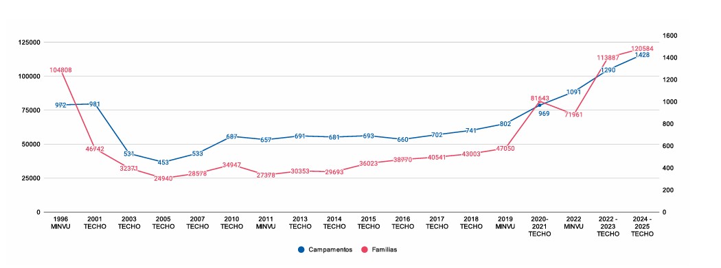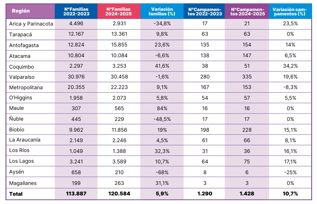Actualmente, 120.584 familias habitan en 1.428 campamentos a nivel nacional, la cifra más alta registrada desde 1996.