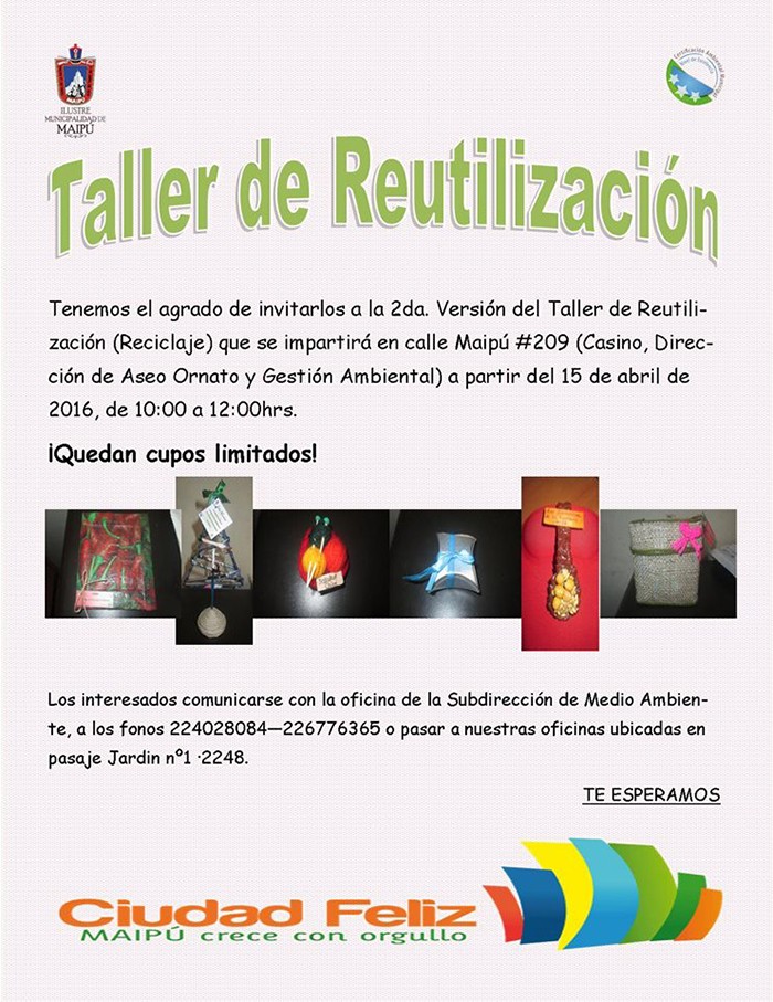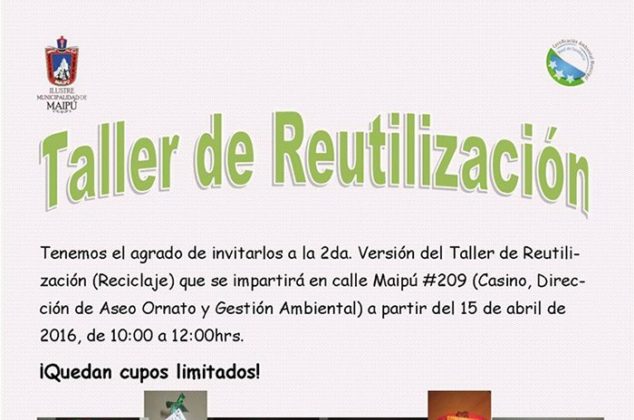Aún quedan cupos para participar en el Taller de Reutilización (Reciclaje), que se imparte desde el viernes 15 de abril en el casino de la Dirección de Aseo, Ornato y Gestión Ambiental de la Municipalidad de Maipú.