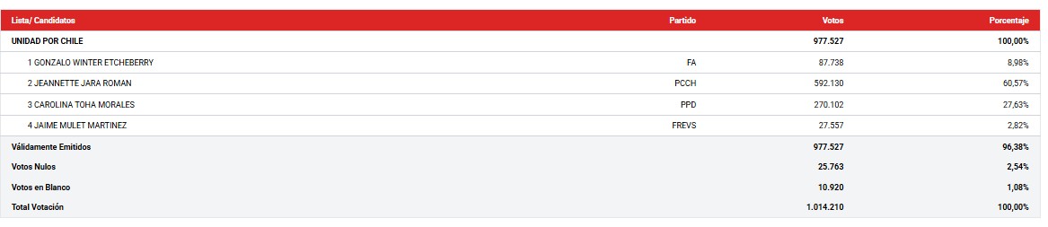 Según los datos parciales entregados por el Servicio Electoral (Servel), Jara —quien representa al Partido Comunista— obtuvo a nivel nacional 587.721 votos, equivalentes al 60,63% del total de sufragios válidamente emitidos. Le siguió Carolina Tohá (PPD), con 267.586 votos (27,61%), mientras que Gonzalo Winter (Frente Amplio) alcanzó el 8,93% con 86.588 votos, y Jaime Mulet (Federación Regionalista Verde Social) cerró la lista con 27.408 votos (2,83%).