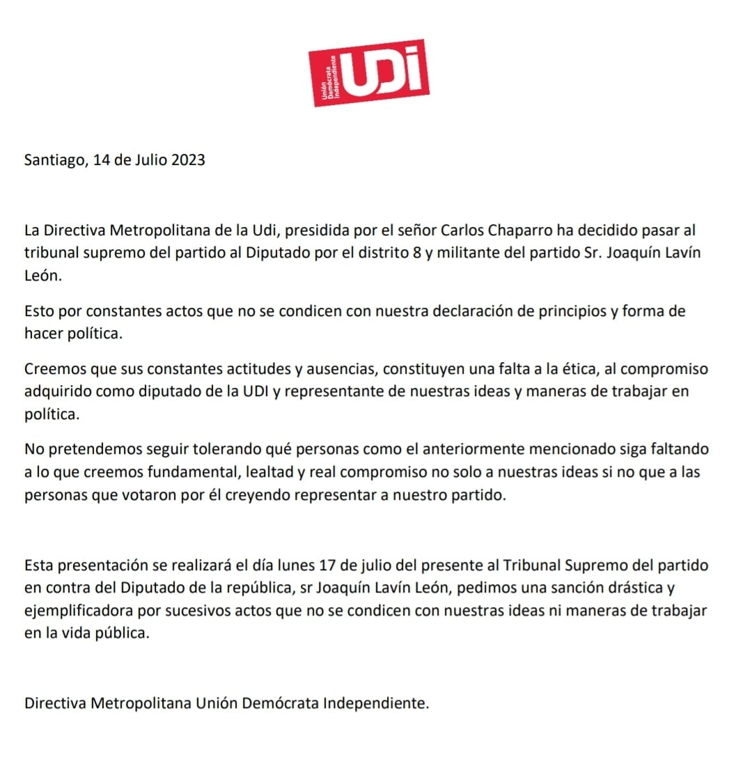 La directiva metropolitana de la UDI, según diversos transcendidos de medios de comunicación nacional, habría tomado la decisión de pasar este lunes 17 de julio al Tribunal Supremo del partido (UDI), al diputado por el Distrito 8 que comprende la comuna de Maipú, Joaquín Lavín León.