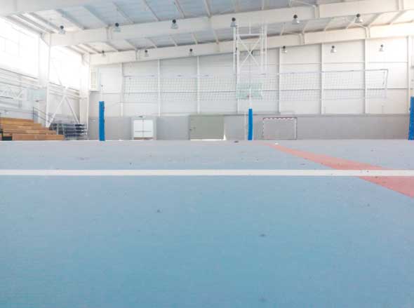 El primero de los espacios que nos enseña Gonzalo es el gimnasio o cancha central. Se trata de dos canchas simultáneas, habilitadas para jugar basquetball, handball, voleyball y fútbol salón. Consta de un piso flotante de caucho, un tipo de goma de bajo impacto especialmente diseñada para no dañar las articulaciones de los deportistas. Posee 42 luminarias. Ademas la sala consta de tablero electrónico, caseta de transmisión y graderías.