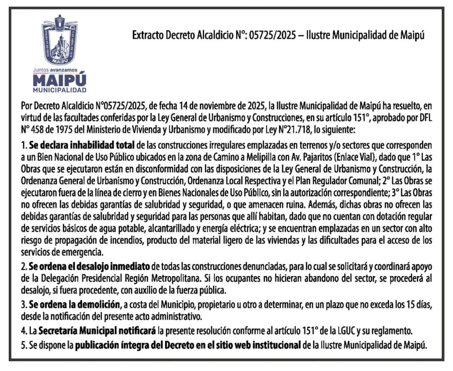La razón sobre la cual se sustenta el desalojo corresponde a lo señalado en el Decreto Alcaldicio 5725 que declara la “inhabilidad total de las construcciones irregulares emplazadas en terrenos y/o sectores que corresponden a un bien nacional de uso público ubicados en la zona de Camino a Melipilla con Av. Pajaritos”.