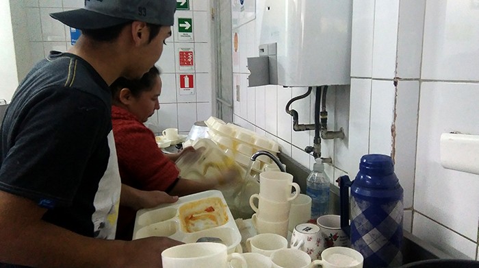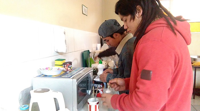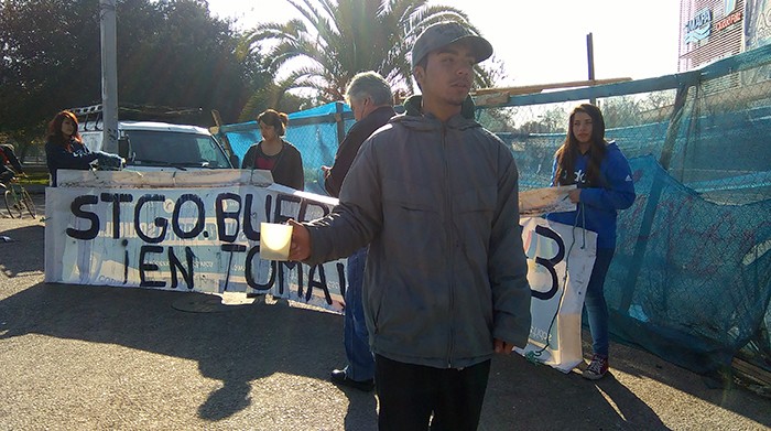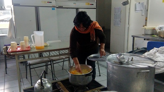 Un momento importante del día está ligado a las comidas, se preocupan de que a la hora del desayuno, almuerzo y cena estén todos presentes para que nadie coma menos que el otro y también como momento de comunión de los participantes. La comida la preparan en el casino del colegio y generalmente cocinan lo que han recibido como aporte de apoderados o que han traído desde sus casas, cuando ha sido necesario han salido a pedir dinero a la plaza de Maipú, pero nos aseguran que esto no es todos los días y que principalmente ha servido para comprar el pan del día.