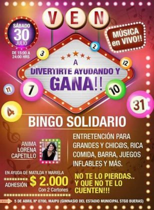 El sábado 30 de julio, entre las 15:00 y las 24:00 hrs., se llevará a cabo en el gimnasio Santiago Bueras (Av 5 de abril 0700), un bingo a beneficio de dos vecinas de la villa Las Lomas de Maipú.