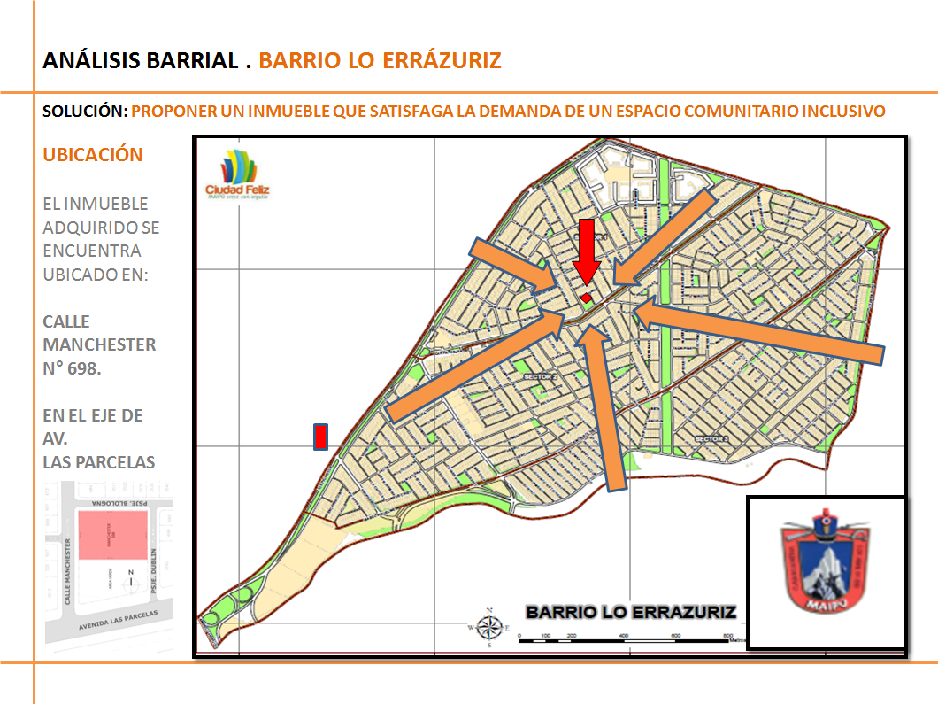 Con el objeto de contar con un equipamiento que permita la implementación de una atención municipal integral a las necesidades de vecinas y vecinos de este barrio, de casi 37.000 habitantes, y por acuerdo del 22 de agosto de 2014, había sido adquirido este inmueble del eje de Av. Las Parcelas, que posee una superficie de 1.164 MT2 en dos pisos, un galpón y 8 salones, a Víctor Francisco Aguilera Vásquez, por la suma de $330.000.000.