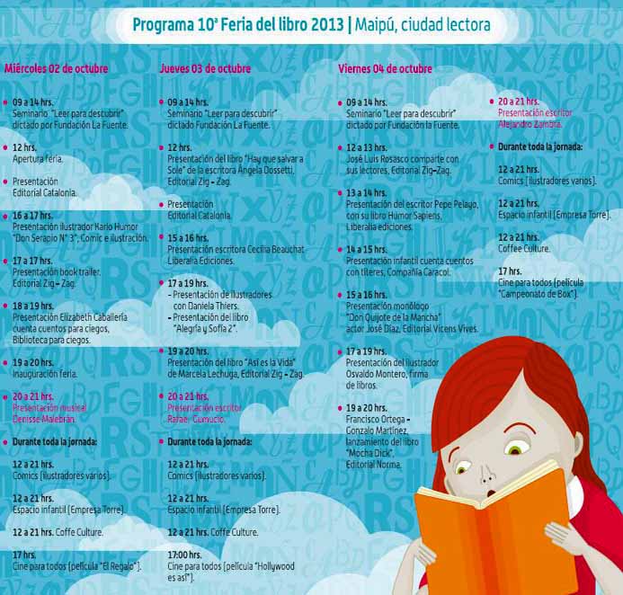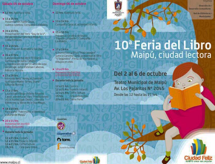 Como lo ha señalado el alcalde Vittori, es una muy buena ocasión para que las familias maipucinas puedan asistir a esta Feria del Libro, cuyo ambiente y entorno permiten efectivamente disfrutar de buenos momentos, la presencia de prestigiosas editoriales, buenos títulos para elegir una siempre importante y saludable lectura, aprovechar las distintas instancias que ofrece el programa para intercambiar y conocer los puntos de vista de escritores invitados entre los que se cuenta a Rafael Gumucio (jueves 3 de octubre a las 20 hrs), Alejandro Zambra (l viernes 4 de octubre 20 horas), Pablo Simonetti.( sábado 5 mismo horario)