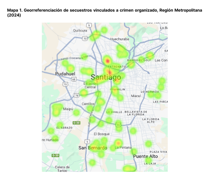 • En la Región Metropolitana, los secuestros ligados a este fenómeno aumentaron un 21% en el primer semestre de 2025 (40) respecto al mismo periodo de 2024 (33)3.
