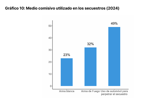 • El uso de armas de fuego en secuestros creció hasta el 32% en 2024, y los automóviles siguen siendo el principal medio de traslado y retención de víctimas (49%).4