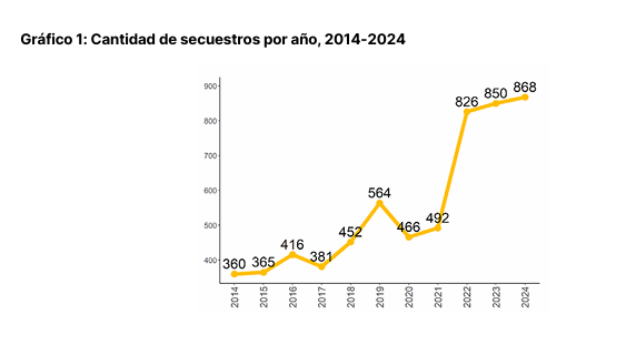 Los secuestros (vinculados o no al crimen organizado) a nivel nacional pasaron de 492 casos en 2021 a 826 en 2022 (un alza del 68%), manteniéndose sobre los 800 casos anuales en 2023 y 2024.