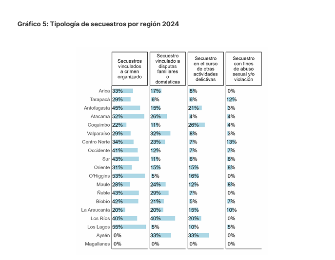 • El 37,8% de los secuestros de 2024 estuvo asociado a tipologías del crimen organizado, frente al 27,2% de 2023.2 «El alza se explica principalmente por el aumento registrado en 2024 de los secuestros con fines de extorsión y los secuestros por ajuste de cuentas, cobro de deudas y venganzas» indica el informe.