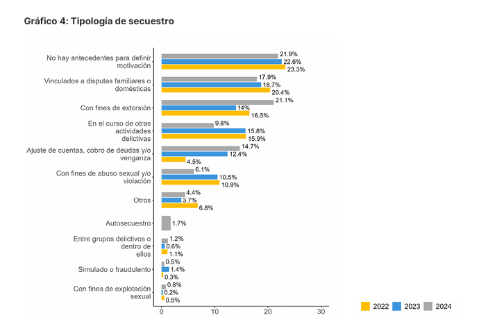 El estudio indica que este tipo de secuestros incluye tipologías como extorsión, ajustes de cuentas, disputas entre bandas y explotación sexual, consideradas por el Ministerio Público como las más próximas al accionar de redes criminales complejas.