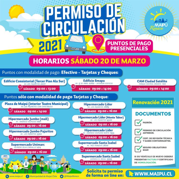 De acuerdo con la información aportada por el municipio de Maipú, los requisitos para el pago del permiso de circulación correspondiente son: