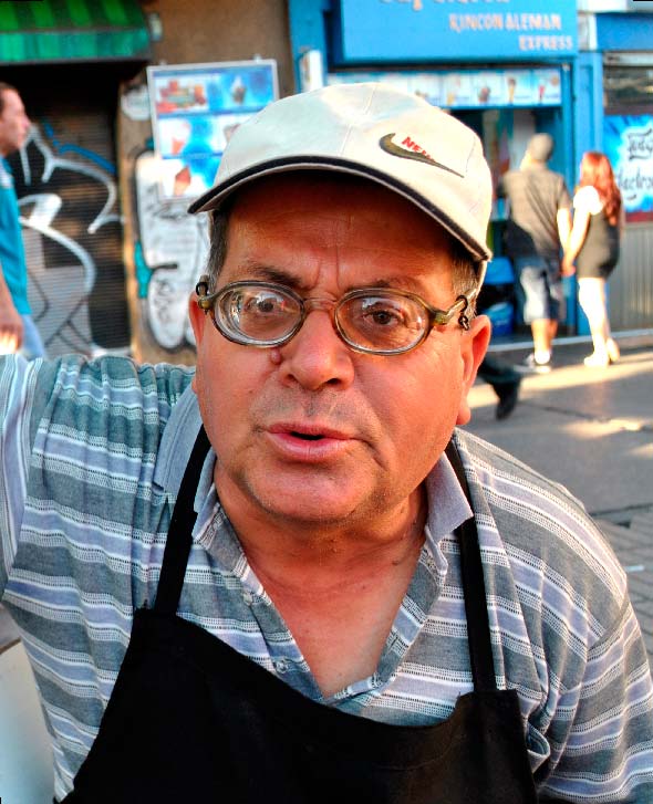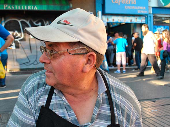 “La gente (apura), el pasar, el conversar, las anécdotas que cuentan. Aquí hay historias también que pasan en la calle. Por ejemplo, la otra vez vino una señora, y estaba detrás de este quiosco y le hizo la pillá al marido. Le dijo: Aquí te quería pillar, conchetumare. ¿Viste que me cagabai, hueón?, ¿viste que vos me cagabai?, le decía al hueón. Y la otra mina se fue pal la’o, se puso pa’ allá a mirar la vitrina. No hallaba que hacer la mina…