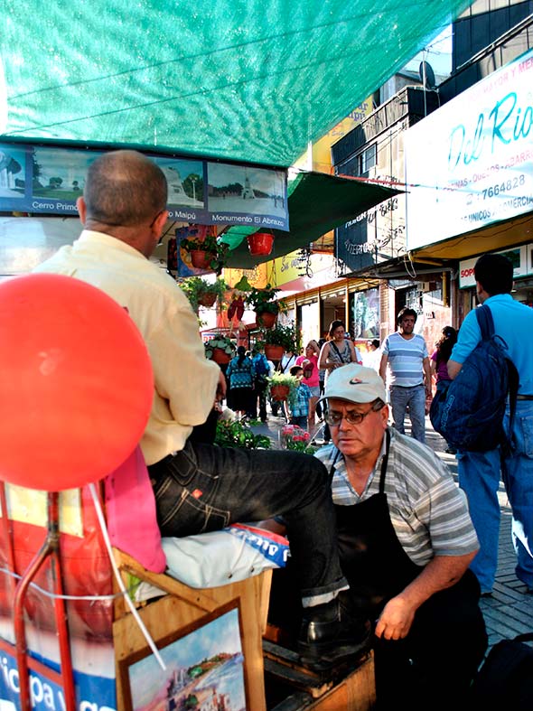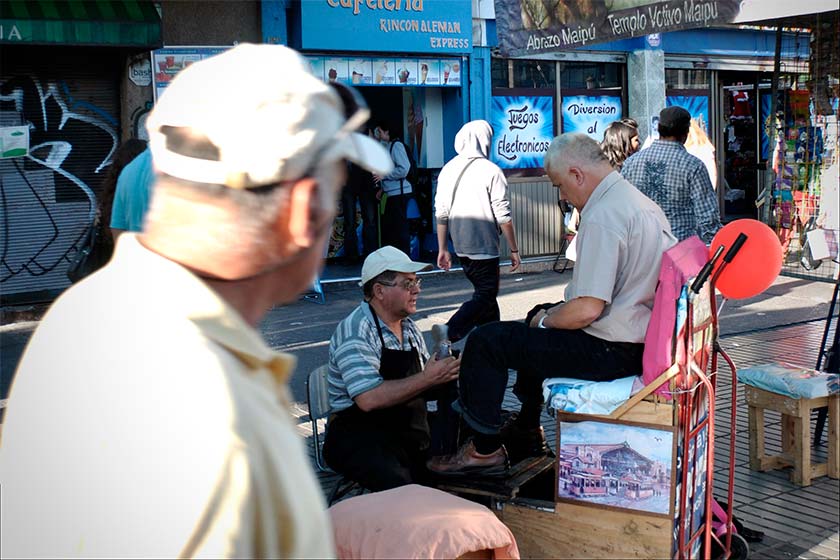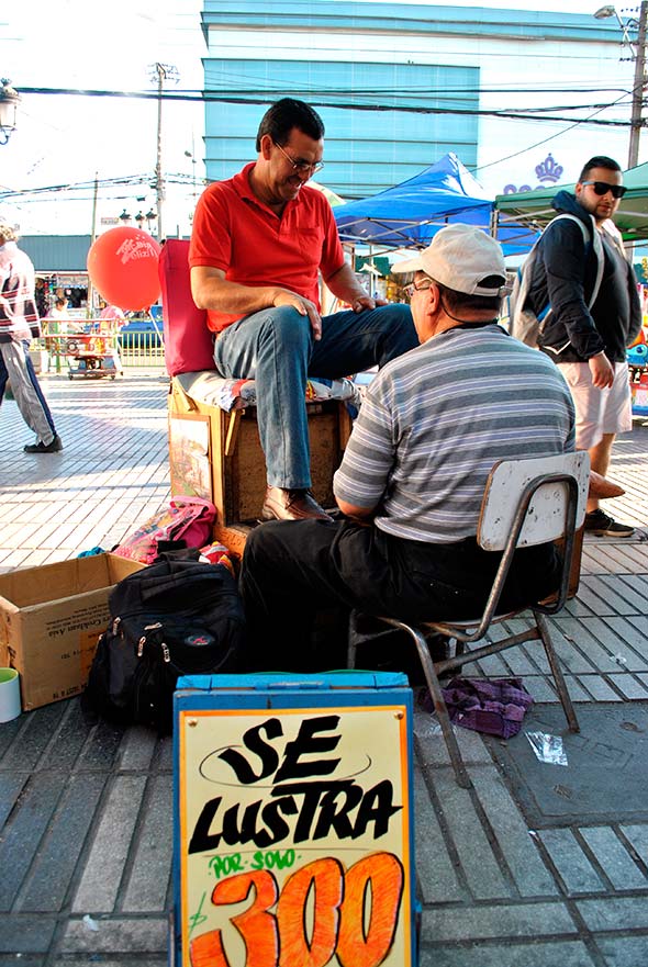 “No, no, no. Pa na’. Gracias al Señor, ni’una calilla… Los economistas en la televisión advierten, pero a la gente le gusta en estos años aparentar. Quién tiene más, quién tiene el televisor más grande, quién tiene el auto más grande… No importa que anden al tres y al cuatro en la semana, comiendo puros fideos y arroz con huevo y arroz con vienesa, pero se dan los lujos de los autos. Todo puro crédito nomás pos. Puro fiado. La apariencia…”.lustabotas4