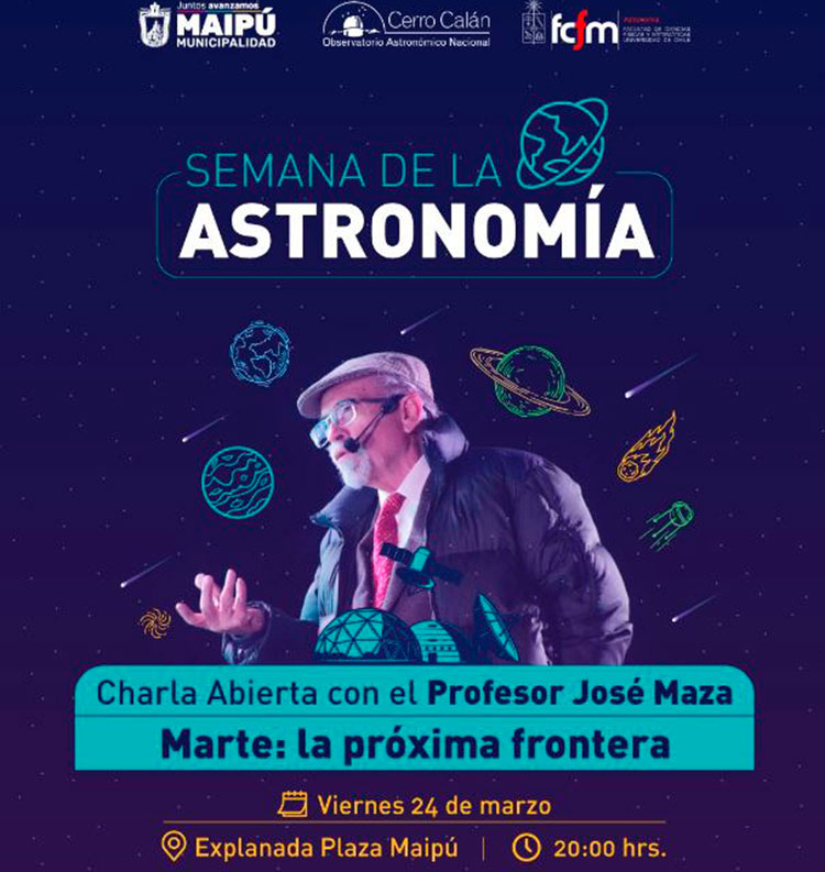 Maipú celebrará el Día de la Astronomía con un destacado invitado. Se trata del profesor José Maza, uno de los astrónomos más reconocidos del país, quien dictará una charla gratuita y abierta en la Plaza de Maipú el próximo viernes 24 de marzo a las 20:00 horas.