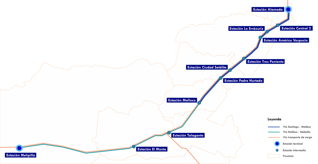 Para este eje, EFE proyecta que el servicio entre Talagante y Lo Errázuriz —con conexión a Metro Línea 6— entre en operación durante el último trimestre de 2027.