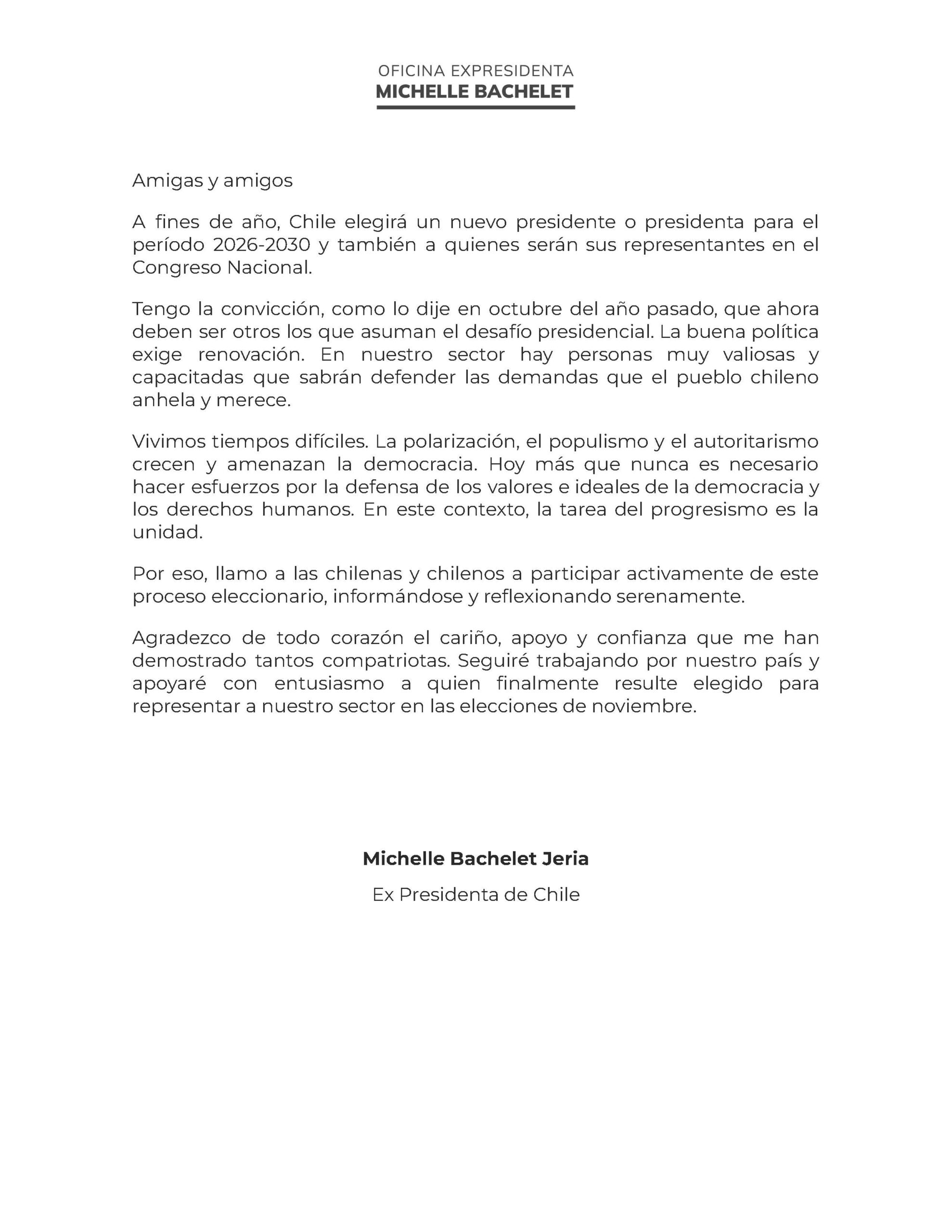 La expresidenta Michelle Bachelet confirmó este miércoles que no será candidata en las elecciones presidenciales de noviembre de 2025. A través de las redes sociales de Fundación Horizonte Ciudadano, de la cual es fundadora, la exmandataria reafirmó su postura de no postularse y destacó la importancia de la renovación política dentro del oficialismo.