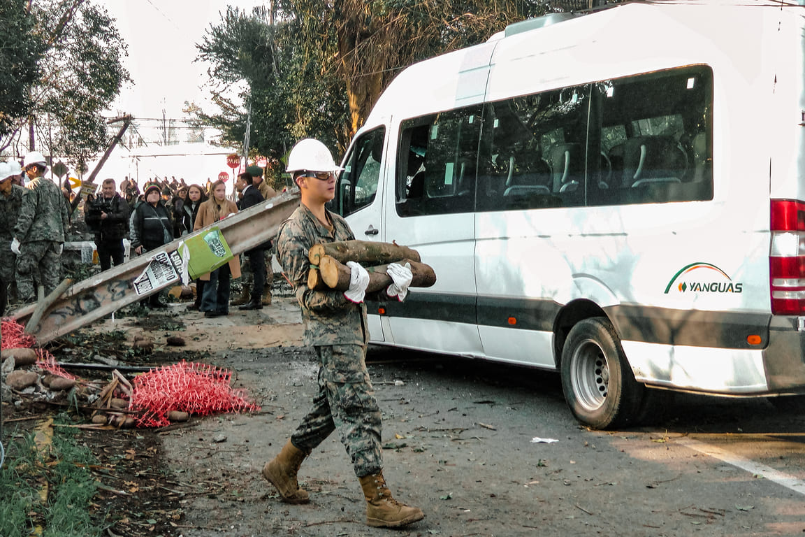 “Bueno, hemos estado en algunas regiones del país ya con funciones de apoyo en emergencia. Esa es la función que corresponde y que hemos coordinado desde la delegación, en conjunto con Senapred, y su función es básicamente retiro de escombros, arbolados que faciliten las labores de la empresa eléctrica”.