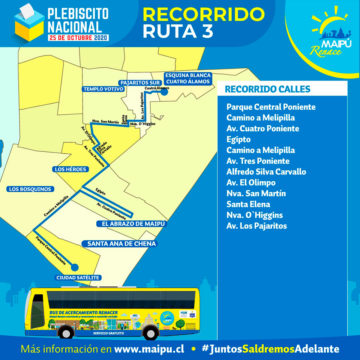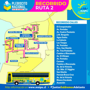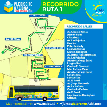 Esta medida impulsada por la Municipalidad de Maipú y su alcaldesa Cathy Barriga, como lo consigna el sitio web corporativo del municipio, tiene como objetivo “recoger y acercar a nuestr@s vecin@s a sus lugares de votación” este servicio señala la información será gratuito el día Domingo del Plebiscito, para lo cual se ha dispuesto de la moderna flota de Buses ecológicos Renacer, programándose este acercamiento y traslado entre las 8:00 y las 21:00 horas.