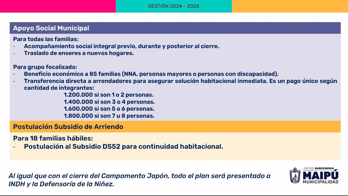 Para quienes no logren acceder a un arriendo a tiempo, la Municipalidad habilitará un albergue temporal con cupos de emergencia. Además, se garantiza el traslado de enseres para todos los habitantes, aunque queda prohibido el movimiento de materiales de construcción o la reubicación en otros campamentos.
