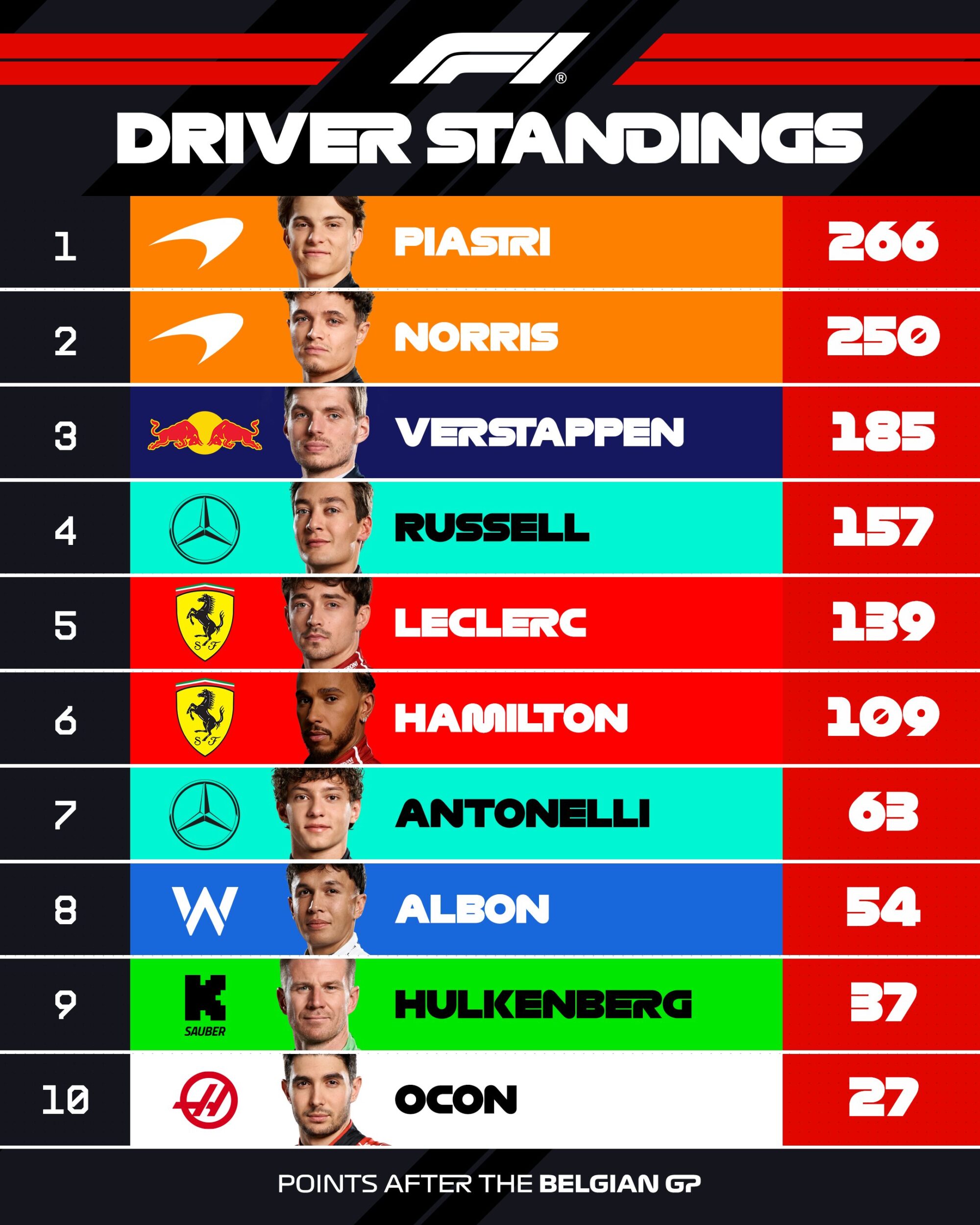 Con este triunfo, Piastri lidera el campeonato con 266 puntos, seguido por Norris (250) y Verstappen (185).