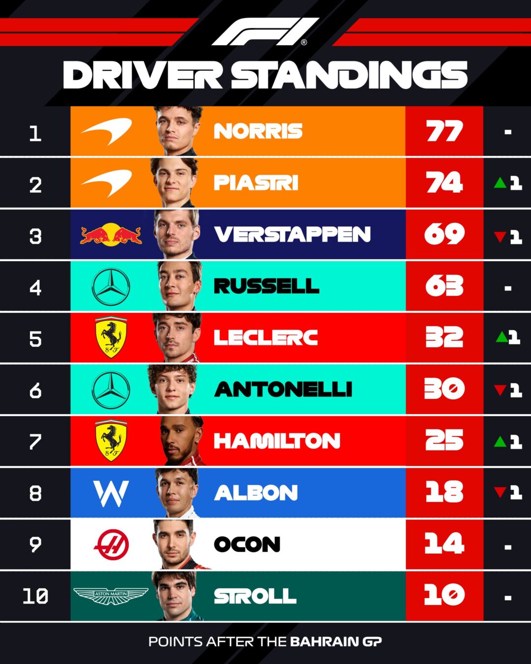 En la clasificación individual, destaca la presencia de Charles Leclerc (Ferrari) en el quinto lugar con 32 unidades, seguido por Kimi Antonelli (Mercedes) con 30 y Lewis Hamilton (Ferrari) con 25. El español Fernando Alonso aún no ha logrado sumar puntos esta temporada, mientras que Carlos Sainz (Williams) apenas tiene uno tras abandonar en Baréin a diez vueltas del final.
