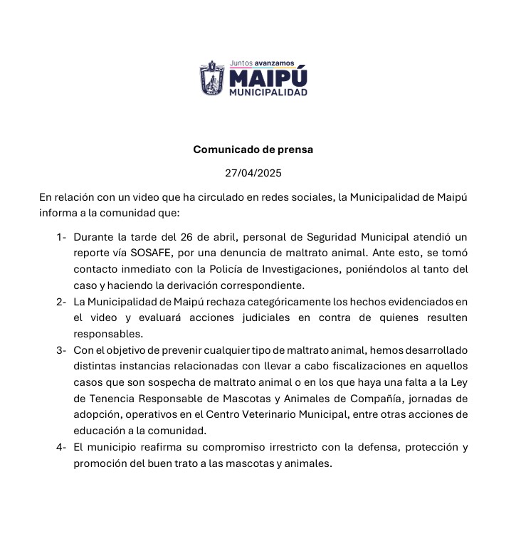 En respuesta al impacto que generó este caso, la Municipalidad de Maipú emitió un comunicado informando que personal de Seguridad Municipal acudió al lugar tras recibir un reporte a través de la plataforma SOSAFE. La Policía de Investigaciones (PDI) fue alertada de inmediato, y el municipio anunció que evalúa acciones judiciales contra los responsables. Asimismo, reafirmaron su compromiso con la protección animal.