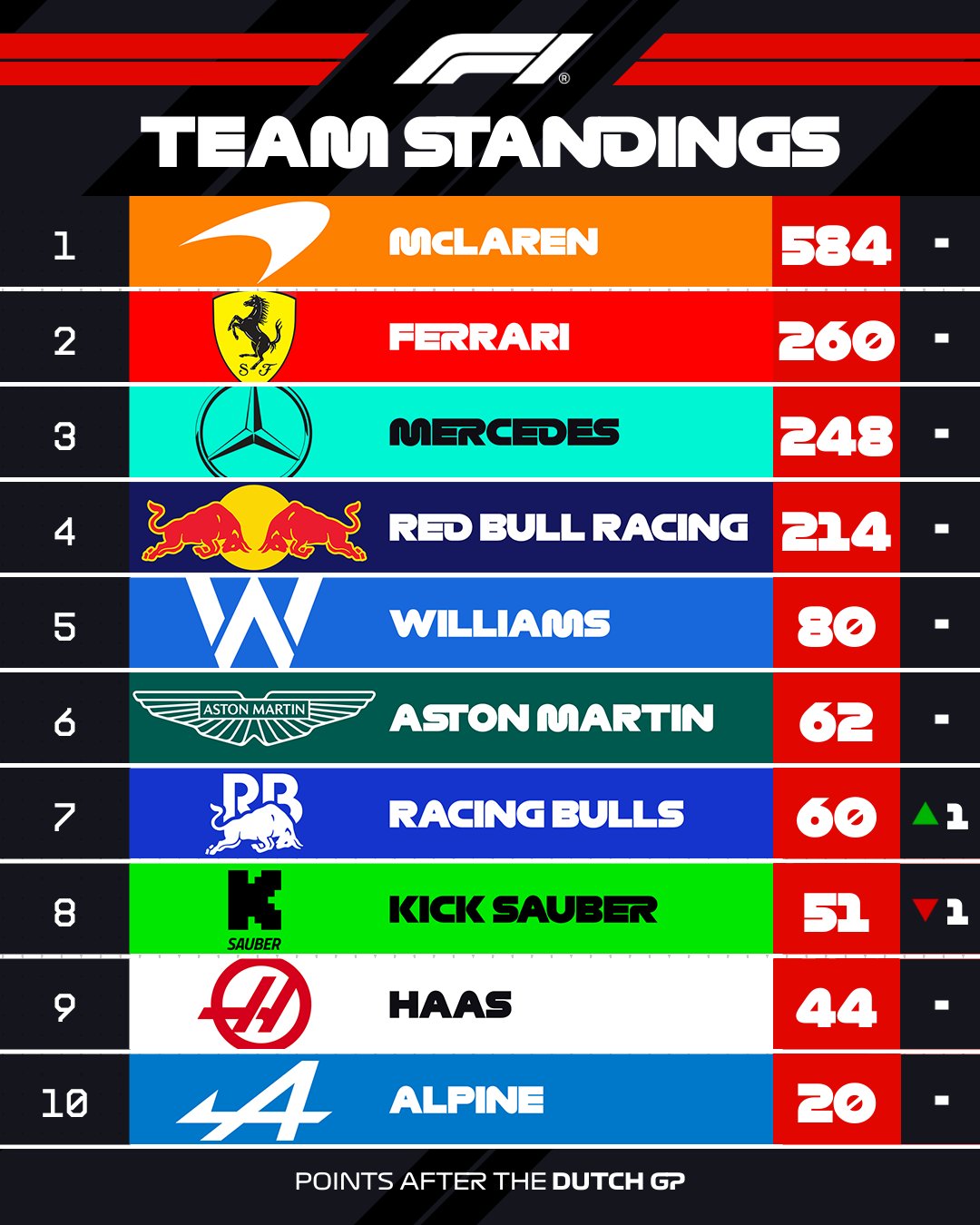Con este resultado, McLaren refuerza su liderato también en el campeonato de constructores con 584 puntos, muy por delante de Ferrari (260) y Mercedes (248). La próxima cita será en Monza, Lombardía, Italia, el 7 de septiembre, donde el campeonato entra en un tramo decisivo.