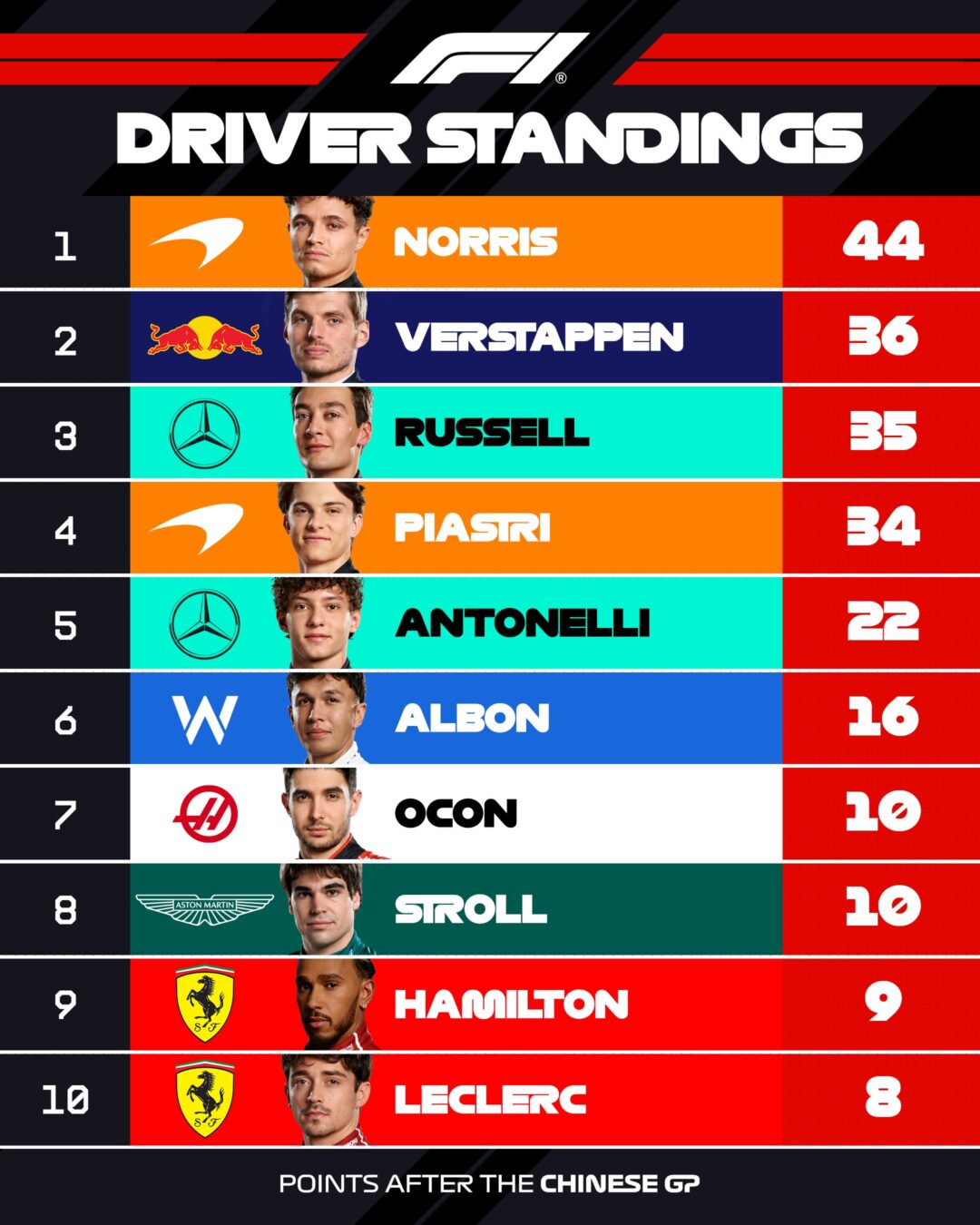 Con la victoria de Oscar Piastri en China, McLaren reafirmó su dominio en 2025. El equipo ya se perfilaba como favorito tras el triunfo de Lando Norris en Australia, y ahora lidera tanto el Mundial de Pilotos como el Campeonato de Constructores.