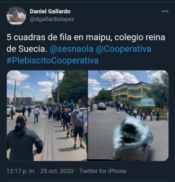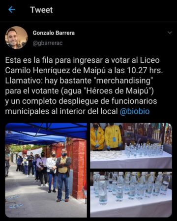 9:20hrs. Escuela 274 B. O’higgins, el apoderado general Víctor Mix nos informa que «Acá votaran todas las personas que gestionaron cambio registral de sexo, los agruparon porque no alcanzaron a modificar datos en el servel y registro civil los validaron para que voten» y nos manda una foto con «ejemplo de cultura cívica, votando a las 08:30»