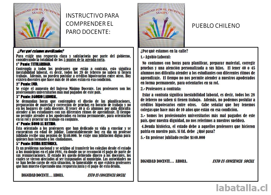 En diversas partes de la comuna, los profesores movilizados de Maipú estuvieron entregando, la tarde del jueves 27 de noviembre de 2014, diversos documentos tendentes a ilustrar a la ciudadanía en las demandas –insatisfechas a juicio de los maestros- respecto de diversos puntos que constituyen lo que se ha llamado “Agenda corta”.