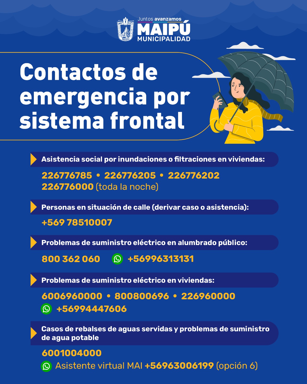 Ante el sistema frontal anunciado por la Dirección Meteorológica de Chile, la Municipalidad de Maipú ha dado a conocer los canales formales para gestionar los apoyos ante eventuales emergencias que puedan surgir en la comuna.