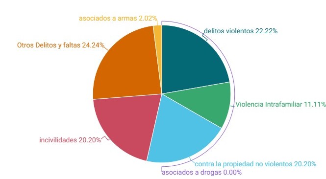 - El 22% de estos casos corresponden a delitos violentos, 11% a Violencia Intrafamiliar, el 20% a delitos contra la propiedad no violentos, otro 20% a incivilidades, 24% a Otros Delitos y faltas, 2% a Delitos asociados a armas y 0% a Delitos asociados a drogas.