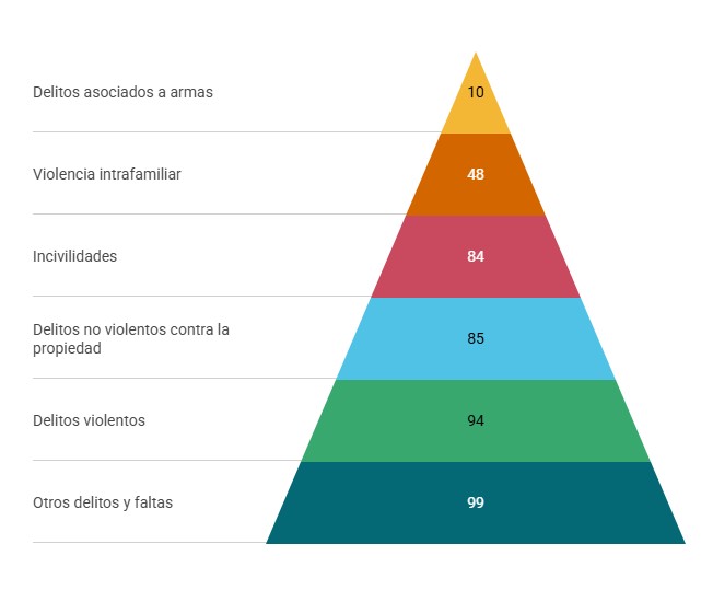 Según información obtenida por La Batalla, la distribución de los casos delictuales fueron: otros delitos y faltas (99 casos), delitos violentos (94 casos), los delitos no violentos contra la propiedad (85 casos), incivilidades (84 casos), violencia intrafamiliar (48 casos) y delitos asociados a armas (10 casos).