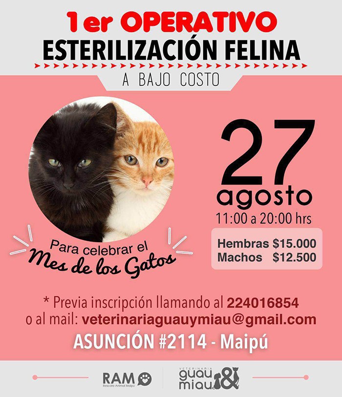 La clínica veterinaria Guau & Miau llevará a cabo un operativo de esterilización felina a bajo costo ($12.500 los machos y $15.000 las hembras), desde las once de la mañana del sábado 27 de agosto, previa inscripción.