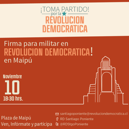 Este martes 10 de noviembre, entre las 18:30 y las 20:30 hrs., Revolución Democrática estará en la Plaza de Maipú, contando sobre su proyecto y su constitución como partido, e invitando a maipucinas y maipucinos a firmar.