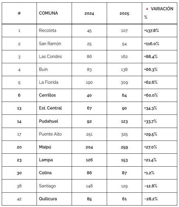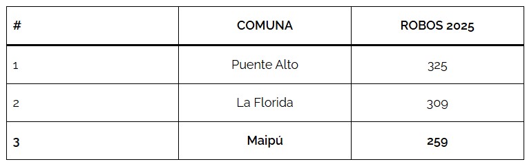 No obstante, el volumen total de casos posiciona a Maipú como una de las tres comunas más afectadas por este delito, con 259 casos, por detrás de los 325 en Puente Alto y 309 en La Florida.