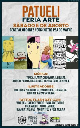 PATUELI es muchas cosas. Una iniciativa surgida desde la convicción de Javier Castro, maipucino de 19 años quien actualmente estudia comunicación audiovisual, también una feria que pretende abrir espacios a artistas y creadores/as desde el trabajo colectivo y la autogestión, finalmente es una jornada que se llevará a cabo el sábado 06 de agosto desde el mediodía en un lugar nuevo y prometedor de Maipú, el Estudio Verde, ubicado en General Ordóñez 356 (póngale ojo y acuérdese, traman varias cosas interesantes allí). Planta Carnívora y su deslenguado rapón, Chopico el alter ego del guatón Salinas, la tremenda Yorka, los locales Cara de Hereje (representantes maipucinos del “Talento Crudo”), LS Durán, ProyectoSolo y Nico Agesta dan vida a la dimensión sónica de esta feria, prácticamente un festival, donde además podrán encontrar a destacados ilustradores/as, tatuadores/as y las más diversas expresiones artísticas imaginables.