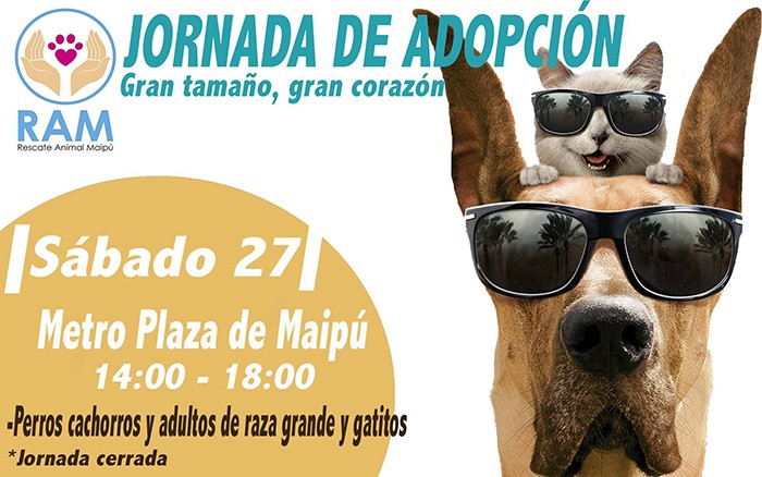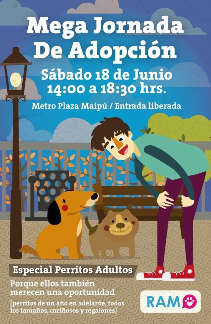 Rescate Animal Maipú realizará una jornada de adopcíon (solo) de perritos adultos rescatados por la agrupación, bajo el lema: "Ellos también merecen una oportunidad". La jornada se realizará este sábado 18 de junio, entre las 14:00 y las 18:30 hrs., a la salida del metro Plaza de Maipú. Quienes deseen adoptar deberán presentar su cédula de identidad. Simultáneamente … [Leer más...]