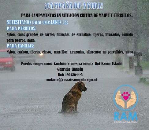Dados los diversos problemas que se han generado a partir del sistema frontal que afecta a la zona centro-sur de Chile, Rescate Animal Maipú ha emprendido una campaña de recolección de ayuda dirigida a los distintos campamentos de la comuna. Es así como estarán recolectando ayuda durante la mañana del lunes 18 desde muy temprano, además de recaudar donaciones en la Plaza … [Leer más...]