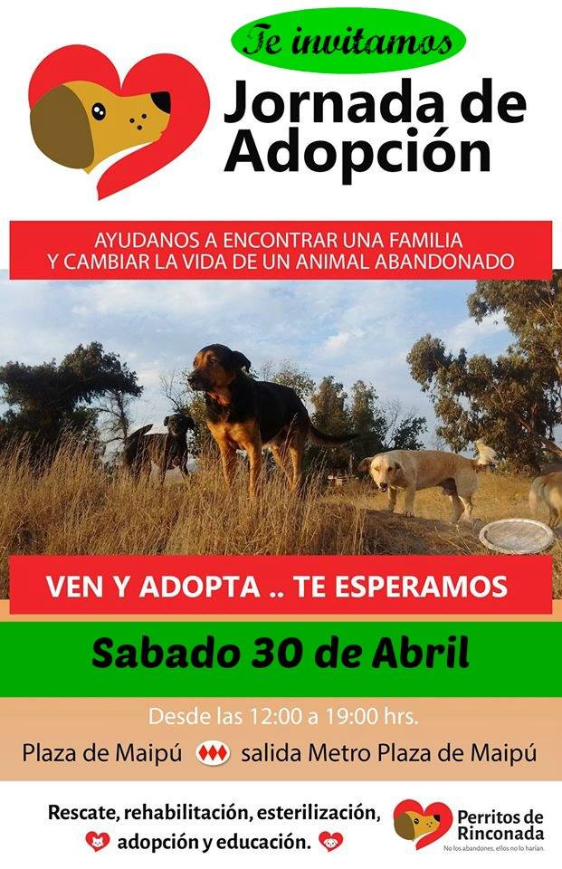 "Ayuda a un perrito a salir del abandono y dejar atrás el sufrimiento, ¡ADOPTA!", es el llamado que la agrupación Perritos de Rinconada hace a las y los vecinos de Maipú. Para el sábado 30 de abril ha fijado una jornada de adopción, que se efectuará en la Plaza Mayor, desde las 12:00 hasta las 19:00 horas. Se trata de una actividad cerrada solo respecto de perros … [Leer más...]