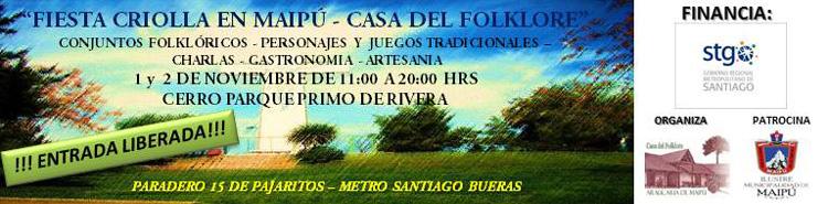 La Casa del Folklore Araucaria de Maipú invita para este fin de semana a la “Fiesta criolla”, a realizarse en el cerro Primo de Rivera (paradero 15 de Pajaritos, estación de metro Santiago Bueras). “Nuestra casa del folklore, en sus 25 años de vida –señaló a La Batalla la directora ejecutiva, Carmen Gloria Silva-, no ha parado de entregar a la comunidad maipucina diversas … [Leer más...]
