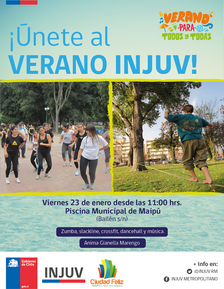El Instituto Nacional de la Juventud (INJUV) de la Región Metropolitana junto a la Municipalidad de Maipú, llaman a los jóvenes a asistir al evento que se realizará el viernes 23 de enero en la piscina municipal de Maipú, desde las 11:00 hasta las 15:00 horas, ubicada en Calle Bailén s/n. Los participantes que tengan entre 15 y 29 años podrán ingresar al recinto gratis, … [Leer más...]
