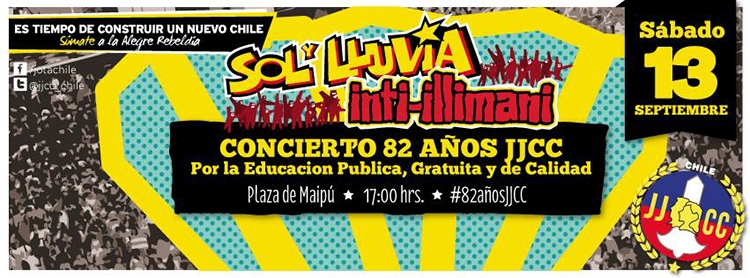 En el marco de las celebraciones por los 82 años de historia de las Juventudes Comunistas de Chile (JJ.CC.) es que las Juventudes Comunistas de Maipú invitan al concierto "Por la Educación Pública, Gratuita y de Calidad". Dicho concierto tendrá lugar en la Plaza de Maipú, a las 17:00 hrs. del próximo sábado 13 de septiembre. Tocarán Sol y Lluvia e … [Leer más...]