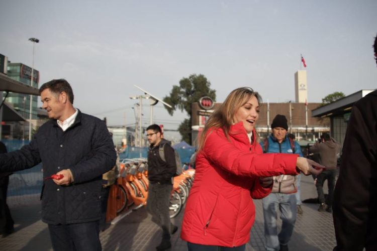 «Esta es mi candidata», dijo con entusiasmo el senador Manuel José Ossandón afuera de la estación del metro Plaza Maipú, mientras presentaba a su postulante RN al Congreso, Andrea Ojeda.