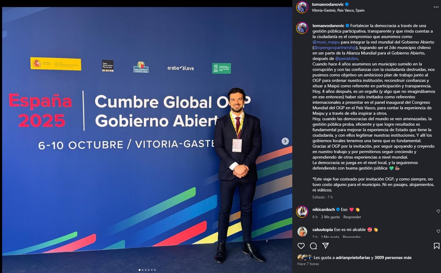 El alcalde de Maipú, Tomás Vodanovic, se encuentra en España participando en el Congreso Mundial del Gobierno Abierto (OGP Global Summit), una instancia internacional que reúne a más de dos mil líderes de gobiernos, sociedad civil y organismos multilaterales para promover la transparencia, la participación ciudadana y la rendición de cuentas en la gestión pública.