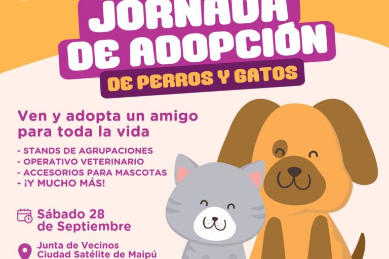 Este sábado 28 de septiembre, la Junta de Vecinos de Ciudad Satélite, en Maipú, organiza una emocionante Jornada de Adopción de Perros y Gatos. El evento se llevará a cabo desde las 11:00 a.m. en la Sede de la junta vecinal ubicada en Las Diademas Sur 18885 (Plaza Las Diademas) donde estarán disponibles muchos animales en busca de un hogar lleno de amor. Además de las … [Leer más...]