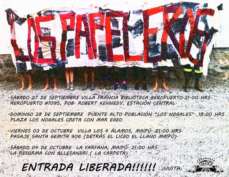Las funciones serán el 03 y el 04 de octubre de 2014 en 4 Álamos y La Farfana, respectivamente. La Compañía de Teatro de Estudiantes y Egresados de la Universidad de Chile (Ceetuch) invita a vecinos y vecinas de Maipú a ver la obra "Los Papeleros", de Isidora Aguirre. "Los Papeleros" cuenta la historia de un grupo de recolectores de papel que habitan un desolado basural. … [Leer más...]