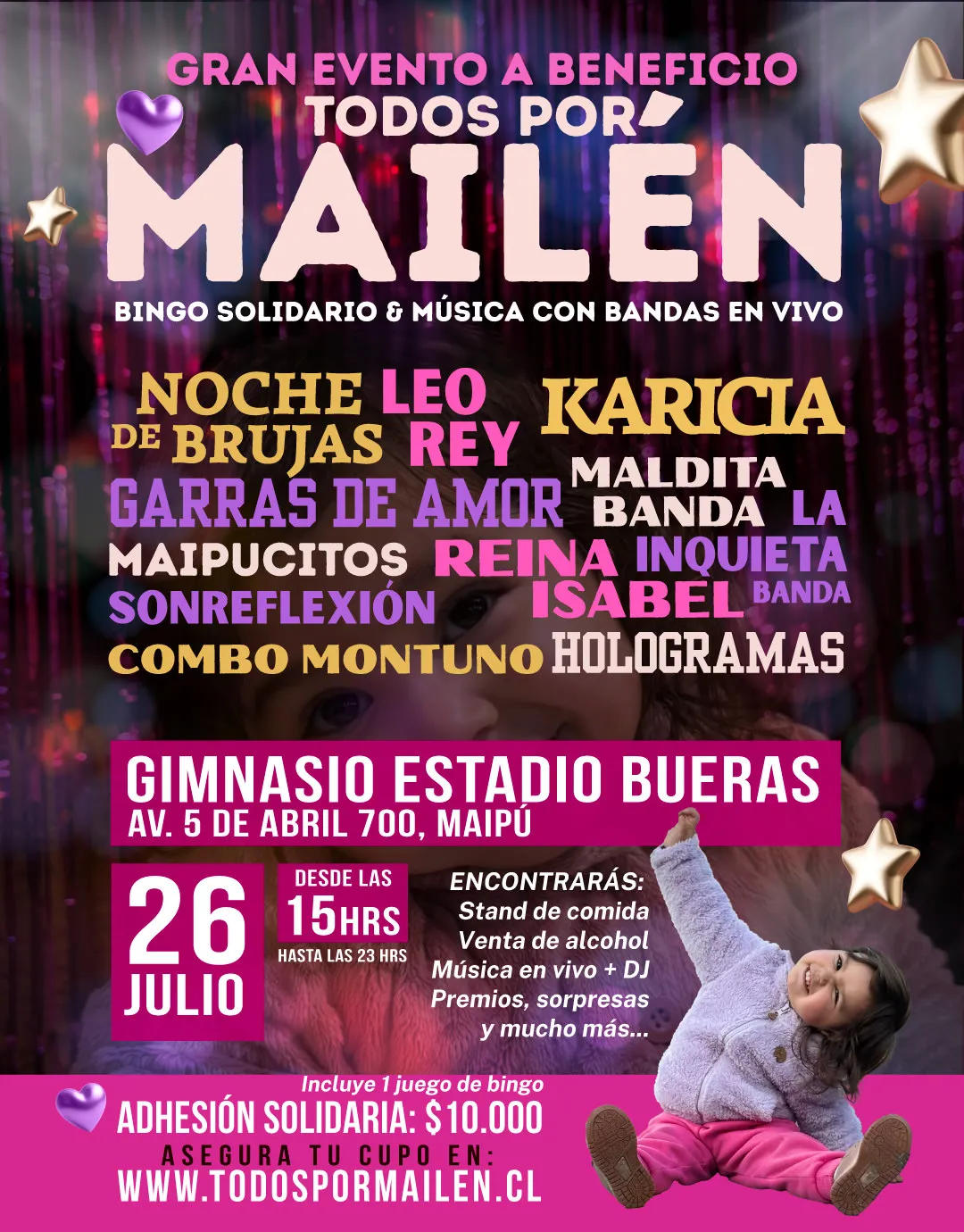 Con apenas dos años, Mailén enfrenta un cáncer cerebral agresivo e inoperable. Su única opción está en España. Por eso, este sábado 26 de julio, de las 15:00 a 23:00 horas en el Estadio Bueras de Maipú, se realizará un evento solidario con música en vivo, premios y bingo para reunir los fondos que pueden salvar su vida.