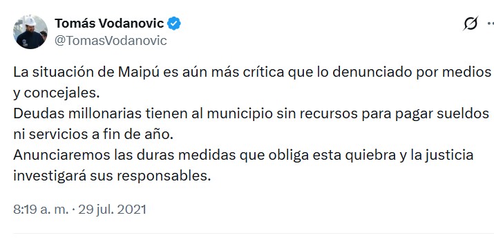 “La situación de Maipú es aún más crítica que lo denunciado por medios y concejales. Deudas millonarias tienen al municipio sin recursos para pagar sueldos ni servicios a fin de año. Anunciaremos las duras medidas que obliga esta quiebra y la justicia investigará sus responsables.”